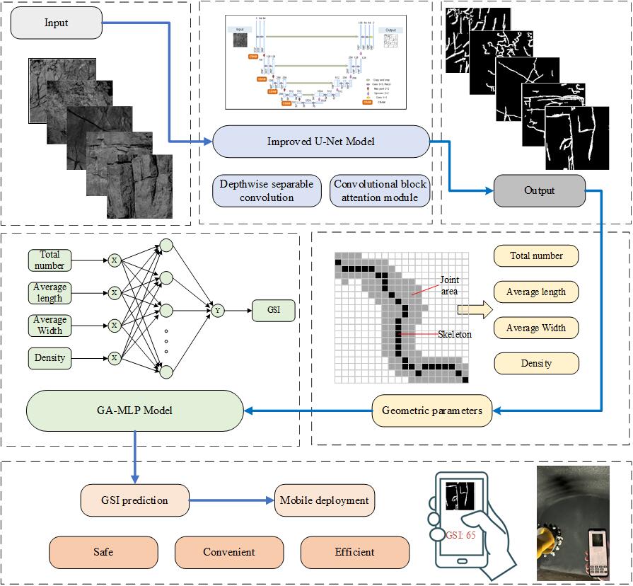 該研究聚焦于如何通過(guò)自動(dòng)化算法提升巷道掌子面巖石節(jié)理地質(zhì)強(qiáng)度指標(biāo)(GSI)預(yù)測(cè)的客觀性與效率這一核心研究問(wèn)題,通過(guò)改進(jìn)U-Net模型與多層感知器(MLP)結(jié)合的深度學(xué)習(xí)方法,結(jié)合實(shí)證分析與移動(dòng)應(yīng)用部署測(cè)試,深入剖析了巖石節(jié)理圖像語(yǔ)義分割、幾何參數(shù)計(jì)算及GSI預(yù)測(cè)的完整流程,有效解決了傳統(tǒng)GSI識(shí)別依賴人工經(jīng)驗(yàn)導(dǎo)致的客觀性不足、效率低下等痛點(diǎn)問(wèn)題,為巷道工程地質(zhì)條件表征與開挖技術(shù)優(yōu)化相關(guān)領(lǐng)域的發(fā)展提供了極具價(jià)值的參考。文章從模型改進(jìn)到實(shí)驗(yàn)驗(yàn)證,再到工程應(yīng)用,對(duì)巷道工程巖石力學(xué)特性分析的理論與實(shí)踐發(fā)展具有重要的指導(dǎo)意義。
